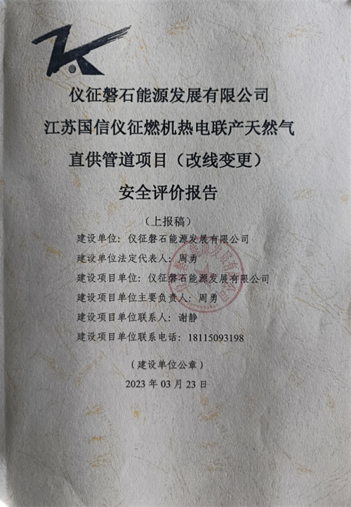 儀征磐石能源發(fā)展有限公司江蘇國信儀征燃機熱電聯(lián)產(chǎn)天然氣直供管道項目(改線變更)安全評價報告 |