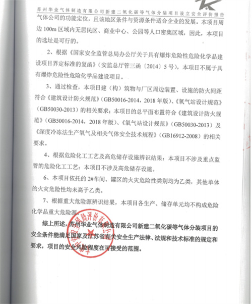 蘇州華業(yè)氣體制造有限公司新建二氧化碳等氣體分裝項(xiàng)目的安全條件能滿足國家及江蘇省有關(guān)安全生產(chǎn)法律、法規(guī)和技術(shù)標(biāo)準(zhǔn)的規(guī)定和要求,項(xiàng)目的安全風(fēng)險(xiǎn)程度在可接受的范圍。 |
