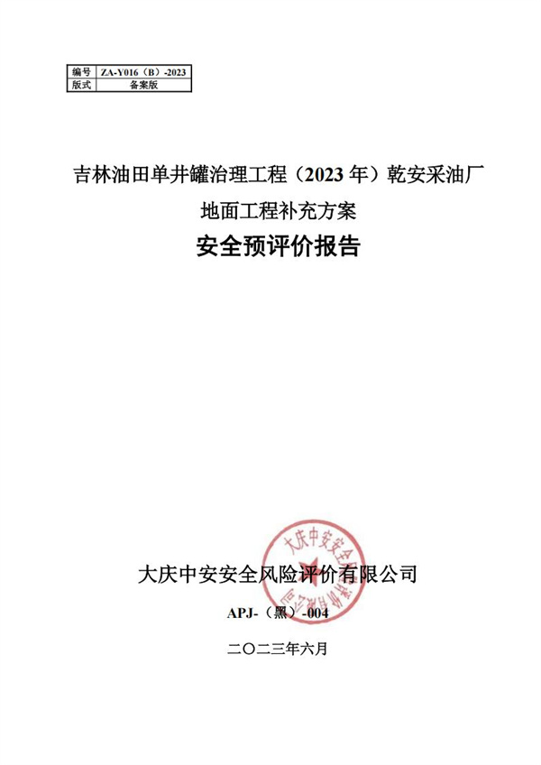 吉林油田單井罐治理工程(2023年)乾安采油廠地面工程補(bǔ)充方案安全預(yù)評(píng)價(jià)