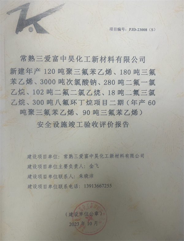 常熟三愛富中昊化工新材料有限公司新建年產(chǎn)120噸聚三氟苯乙烯、180噸三氟苯乙烯、3000噸次氯酸鈉、280噸二氟一氯乙烷、102噸二氟二氯乙烷、18噸二氟三氯乙烷、300噸八氟環(huán)丁烷項目二期(年產(chǎn)60噸聚三氟苯乙烯、90噸三氟苯乙烯)安全設(shè)施竣工驗收評價報告