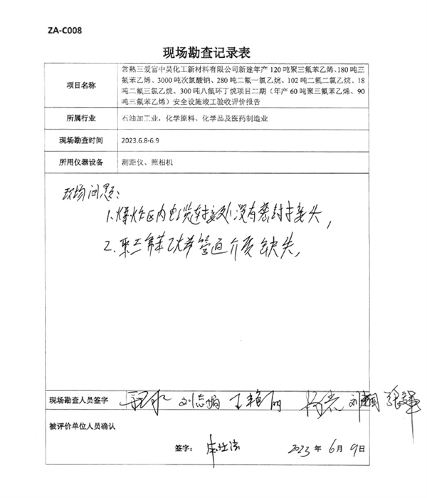 常熟三愛富中昊化工新材料有限公司新建年產(chǎn)120噸聚三氟苯乙烯、180噸三氟苯乙烯、3000噸次氯酸鈉、280噸二氟一氯乙烷、102噸二氟二氯乙烷、18噸二氟三氯乙烷、300噸八氟環(huán)丁烷項目二期(年產(chǎn)60噸聚三氟苯乙烯、90噸三氟苯乙烯)安全設(shè)施符合設(shè)計要求,具備安全設(shè)施竣工驗收條件。 |