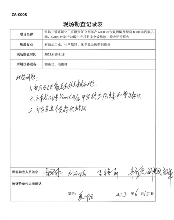 常熟三愛富氟化工有限責(zé)任公司年產(chǎn)6000噸六氟丙烯及配套8000噸四氟乙烯、52000噸副產(chǎn)鹽酸生產(chǎn)項(xiàng)目安全設(shè)施符合設(shè)計(jì)要求,具備安全設(shè)施竣工驗(yàn)收條件。 |