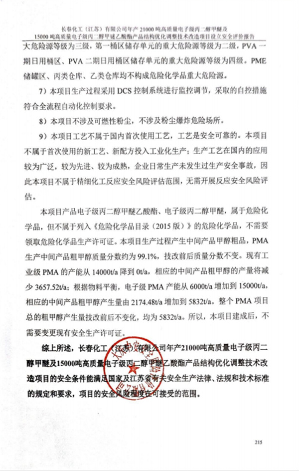 長春化工(江蘇)有限公司年產(chǎn)21000噸高質(zhì)量電子級丙二醇甲醚及15000噸高質(zhì)量電子級丙二醇甲醚乙酸酯產(chǎn)品結(jié)構(gòu)優(yōu)化調(diào)整技術(shù)改造項目的安全條件能滿足國家及江蘇省有關(guān)安全生產(chǎn)法律、法規(guī)和技術(shù)標(biāo)準(zhǔn)的規(guī)定和要求,項目的安全風(fēng)險程度在可接受的范圍。  |