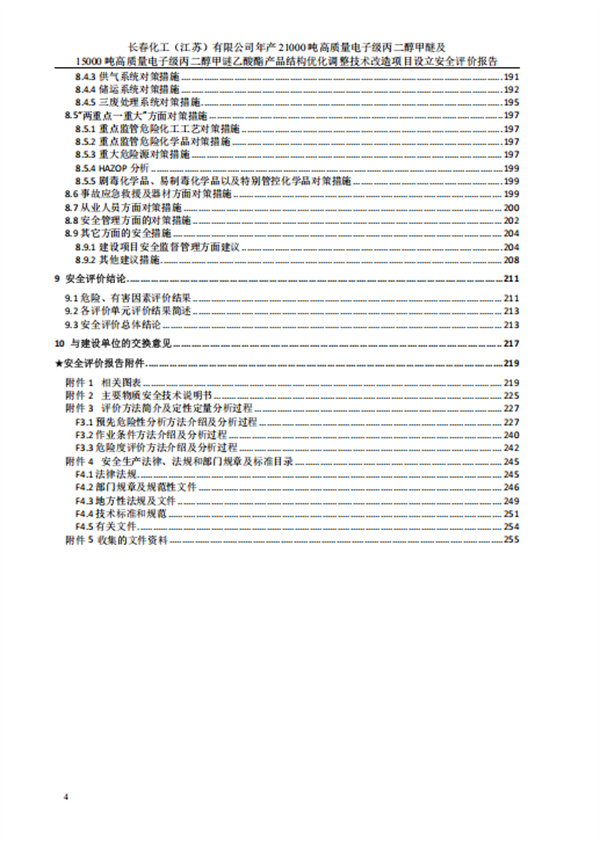 長春化工(江蘇)有限公司年產(chǎn)21000噸高質(zhì)量電子級丙二醇甲醚及15000噸高質(zhì)量電子級丙二醇甲醚乙酸酯產(chǎn)品結(jié)構(gòu)優(yōu)化調(diào)整技術(shù)改造項目所涉及到的主要生產(chǎn)裝置、工藝及物料、公用工程及儲運(yùn)設(shè)施、項目安全條件和安全生產(chǎn)條件等進(jìn)行定性定量安全評價,并對建設(shè)項目可能存在的危險、有害因素提出相應(yīng)的對策措施。  |