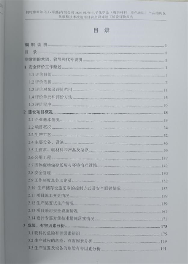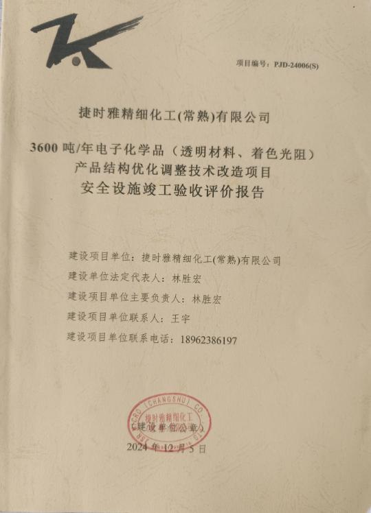 捷時(shí)雅精細(xì)化工(常熟)有限公司3600噸/年電子化學(xué)品(透明材料、著色光阻)產(chǎn)品結(jié)構(gòu)優(yōu)化調(diào)整技術(shù)改造項(xiàng)目安全設(shè)施竣工驗(yàn)收評(píng)價(jià)報(bào)告