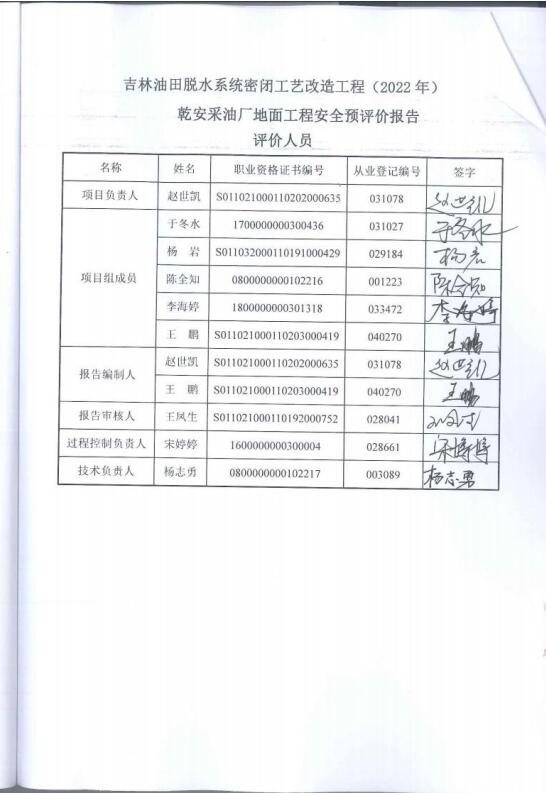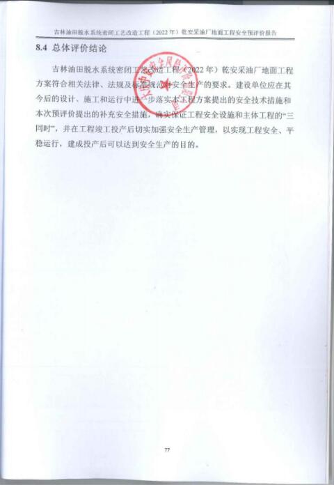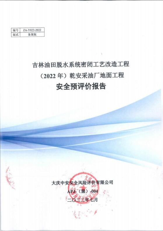 吉林油田脫水系統(tǒng)密閉工藝改造工程(2022年)乾安采油廠地面工程 安全評價(jià)報(bào)告