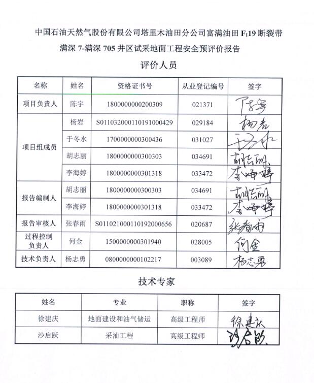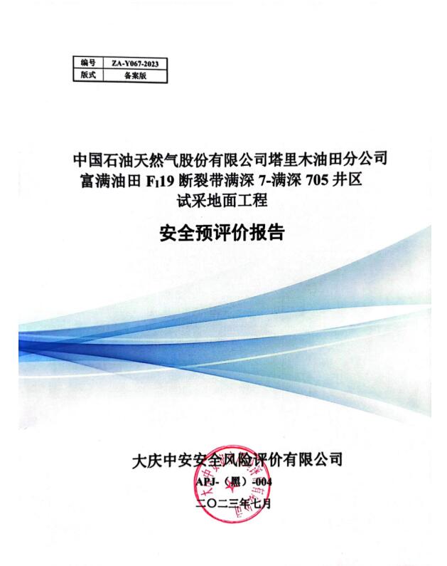 中國石油天然氣股份有限公司塔里木油田分公司富滿油田FI19斷裂帶滿深7-滿深705井區(qū)試采地面工程安全預評價