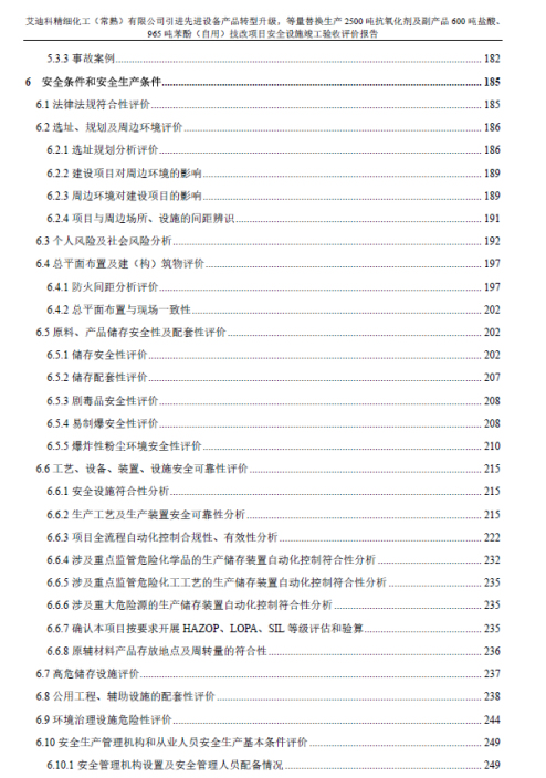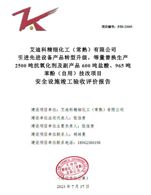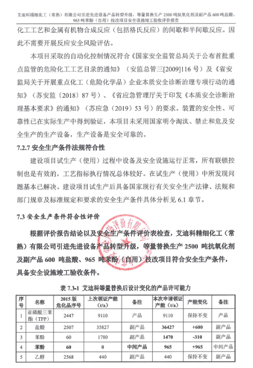 艾迪科精細(xì)化工(常熟)有限公司引進(jìn)先進(jìn)設(shè)備產(chǎn)品轉(zhuǎn)型升級,等量替換生產(chǎn)2500 噸抗氧化劑及副產(chǎn)品600 噸鹽酸、965 噸苯酚(自用)技改項(xiàng)目符合安全生產(chǎn)條件,具備安全設(shè)施竣工驗(yàn)收條件。