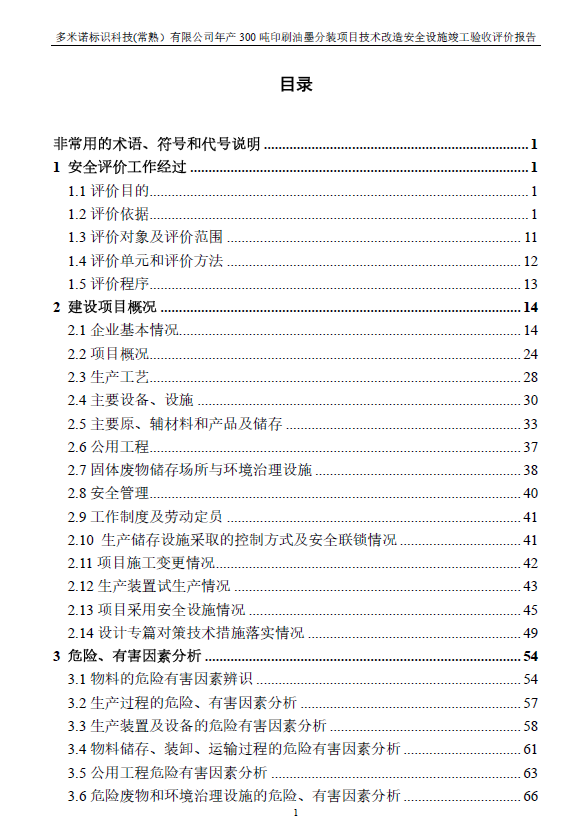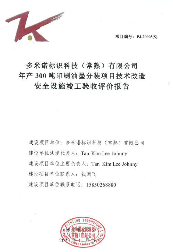 多米諾標識科技(常熟)有限公司年產(chǎn)300噸印刷油墨分裝項目技術(shù)改造 安全設(shè)施竣工驗收評價報告