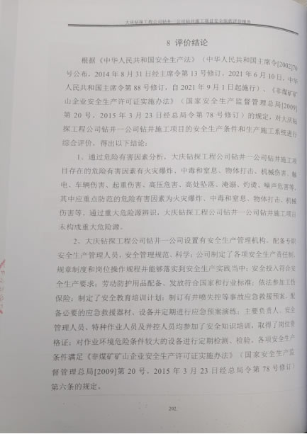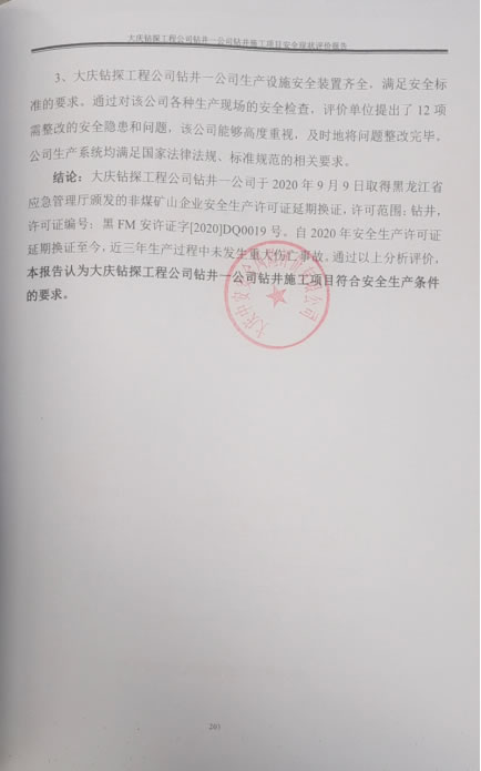 大慶鉆探工程公司鉆井二公司于2020年09月09日取得黑龍江省應(yīng)急管理廳頒發(fā)的非煤礦山企業(yè)安全生產(chǎn)許可證延期換證,許可范圍:鉆井,許可證編號:黑FM安許證字[2020]DQ0020號。自2020年安全生產(chǎn)許可證延期換證至今,近三年生產(chǎn)過程中未發(fā)生重大傷亡事故。通過以上分析評價,本報告認(rèn)為大慶鉆探工程公司鉆井二公司鉆井施工項目符合安全生產(chǎn)條件的要求。 |