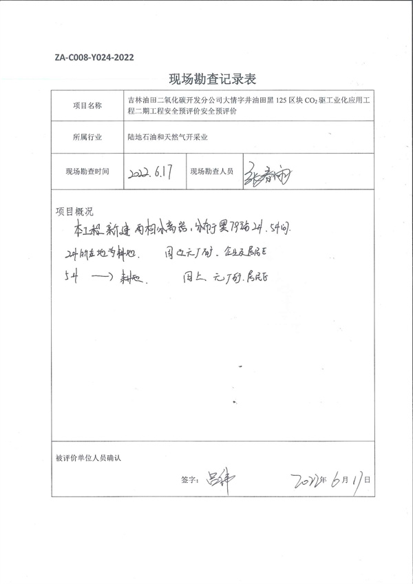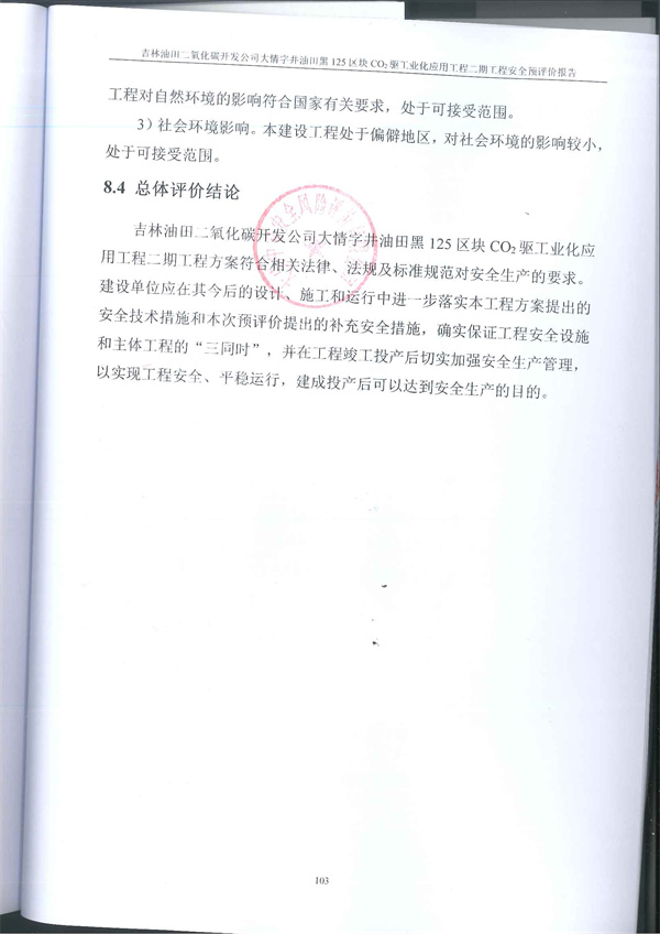 吉林油田二氧化碳開發(fā)公司大情字井油田黑125區(qū)塊CO2驅工業(yè)化應用工程二期工程安全預評價報告 |