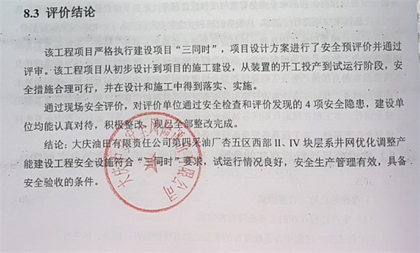 結(jié)論:大慶油田有限責(zé)任公司第四采油廠杏五區(qū)西部II、IV塊層系井網(wǎng)優(yōu)化調(diào)整產(chǎn)能建設(shè)工程安全設(shè)施符合“三同時”要求,試運(yùn)行情況良好,安全生產(chǎn)管理有效,具備安全驗(yàn)收的條件。 |