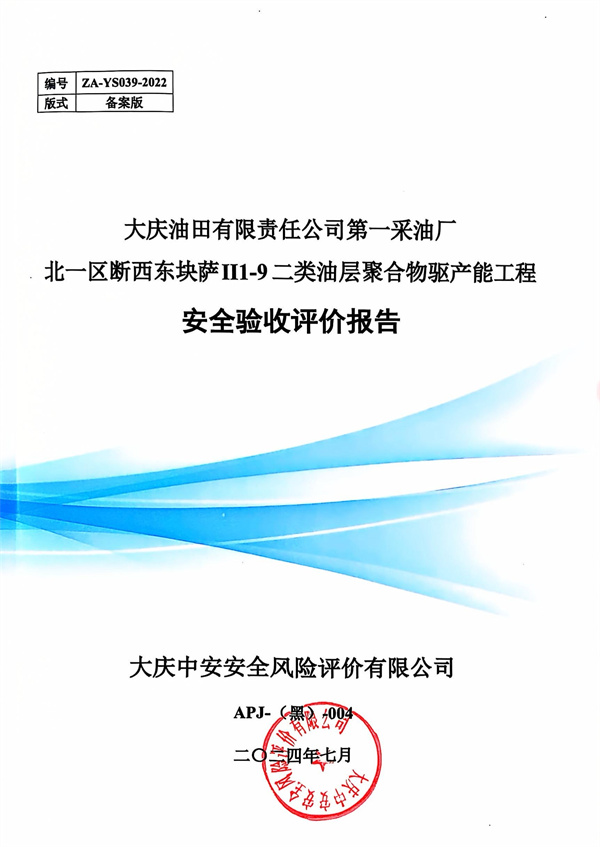 大慶油田有限責任公司第一采油廠北一區(qū)斷西東塊薩II1-9二類油層聚合物驅產能工程安全驗收評價報告